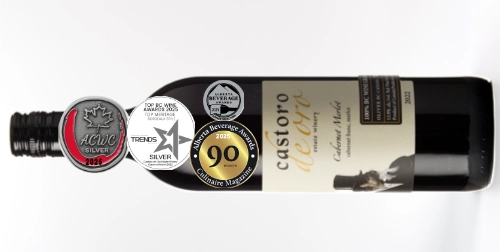 BOLD and Dry (less than 2 g/l.) This blend of cabernet franc and merlot offers vibrant notes of ripe cherry, raspberry, blackberry with notes of vanilla, dark chocolate and earthy complexity. Medium tannins and a dark ruby colour. THIS VINTAGE IS AVAILABLE, ONLY IN BOTTLES, AND (so far) IT IS ONLY SOLD AT THE CASTORO DE ORO ESTATE WINERY ON-SITE WINE SHOP OR BY DIRECT TO CONSUMER SHIPPING IN BC.