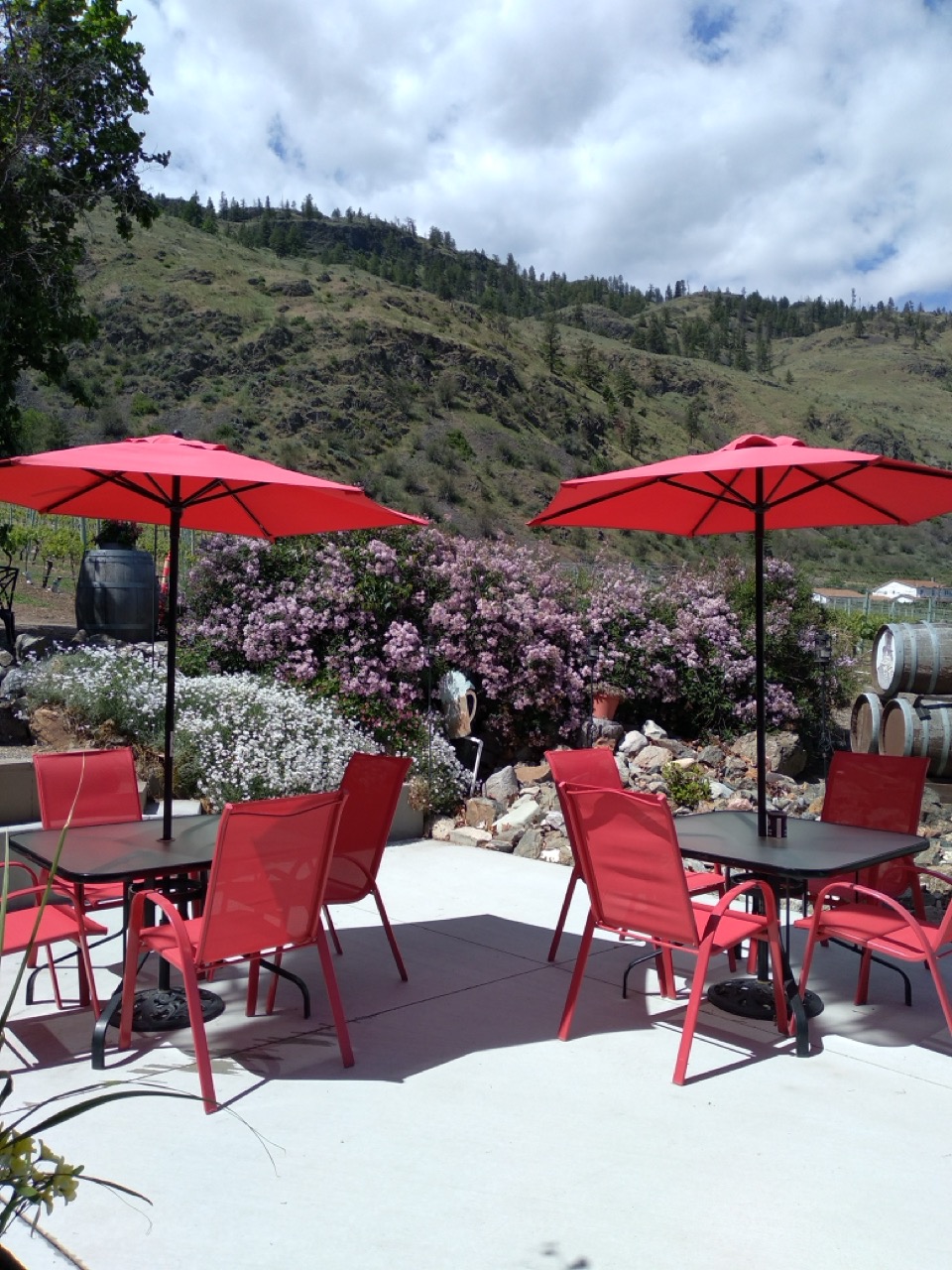 We have a lovely little picnic area available where you can enjoy sharing a bottle, or a can, of our wine, and soak in our view of vineyards, mountains and Mirror Lake.